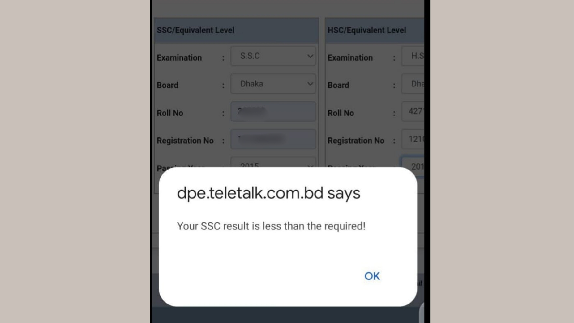 চাকরিপ্রার্থীরা জানান, বারবার চেষ্টা করা সত্ত্বেও আবেদন সম্পন্ন করা যাচ্ছে না। আবেদন করার সময় এসএসসি ও এইচএসসির তথ্য দেওয়ার পর, ‘Your SSC result is less than the required!’ লেখা আসে। এতে আবেদনের প্রথম ধাপই সম্পন্ন করা যাচ্ছে না।