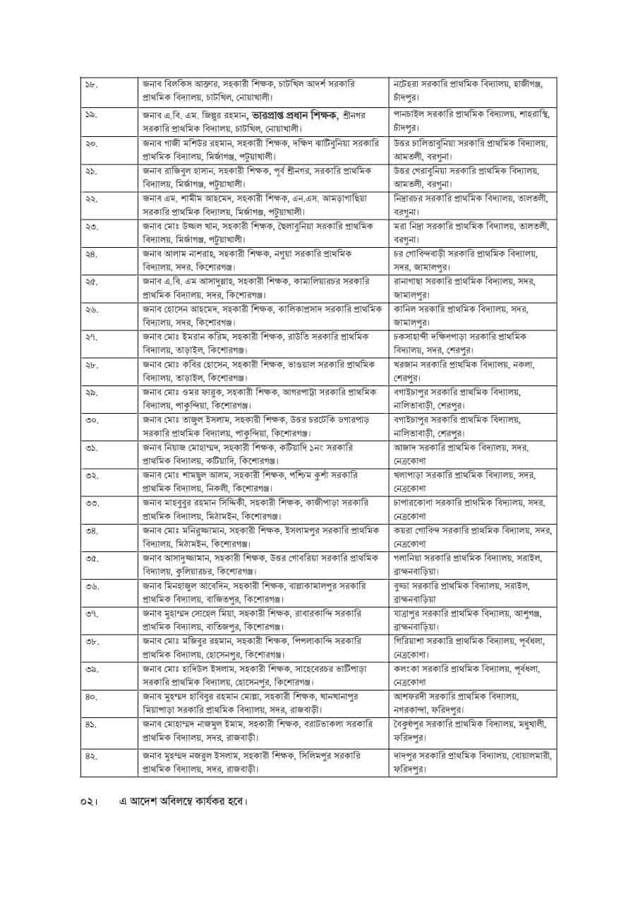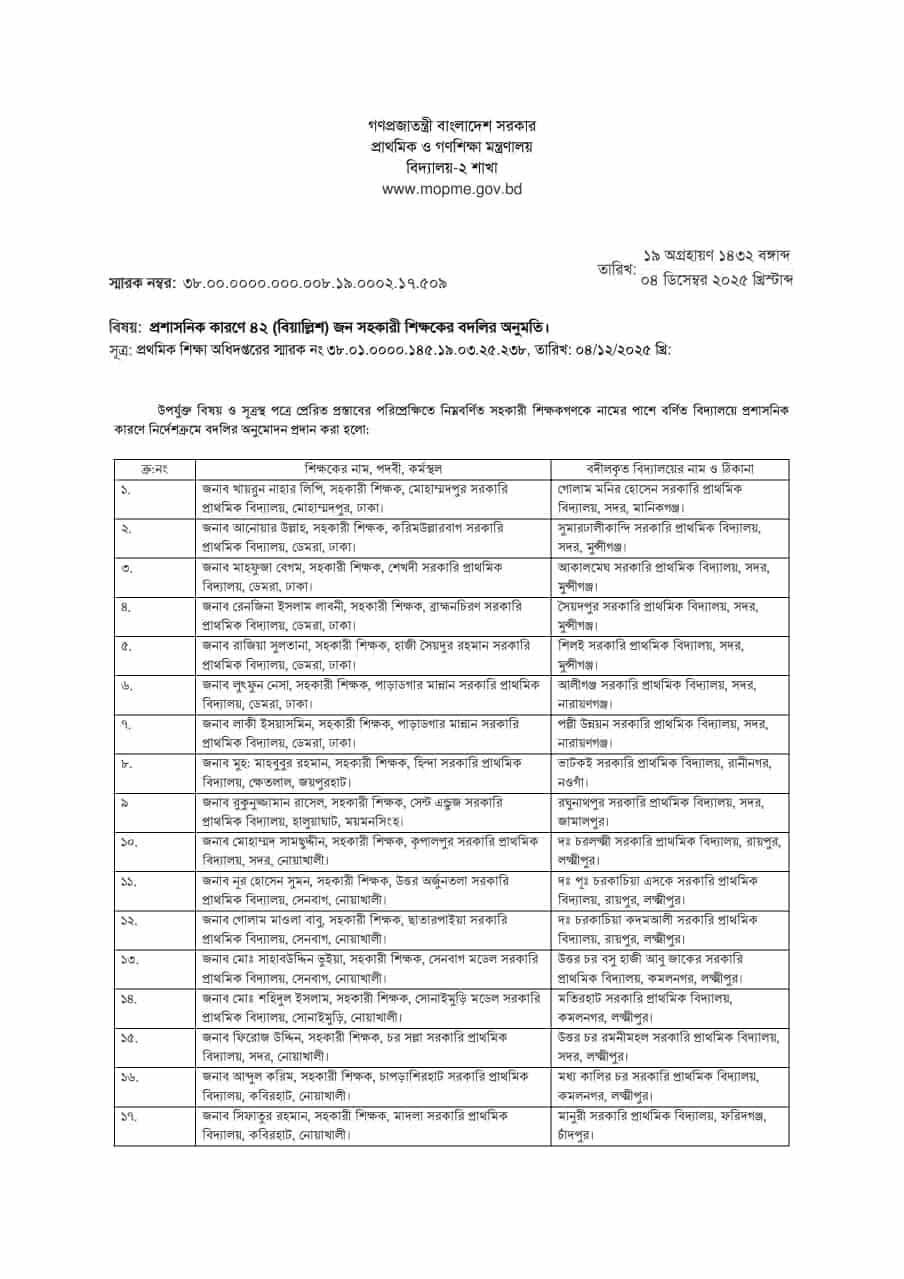 প্রাথমিক ও গণশিক্ষা মন্ত্রণালয়ের ওই আদেশে বলা হয়, প্রাথমিক শিক্ষা অধিদপ্তরের এক স্মারকে পরিপ্রেক্ষিতে তাদের বদলির অনুমোদন প্রদান করা হল।