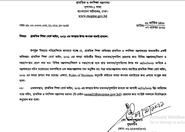 মন্ত্রণালয় বলছে, প্রাথমিক শিক্ষা বোর্ড আইন-২০২১ এর খসড়ার ওপর মতামত সুপারিশ আগামী ২৫ নভেম্বরের মধ্যে ইমেইলে (sasad1@mopme.gov.bd) প্রাথমিক ও গণশিক্ষা মন্ত্রণালয়ে পাঠাতে বলা হয়েছে সংশ্লিষ্ট সবাইকে।