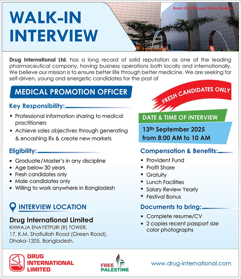 অভিজ্ঞতা ছাড়াই চাকরি ড্রাগ ইন্টারন্যাশনালে, নেবে মেডিকেল প্রমোশন অফিসার