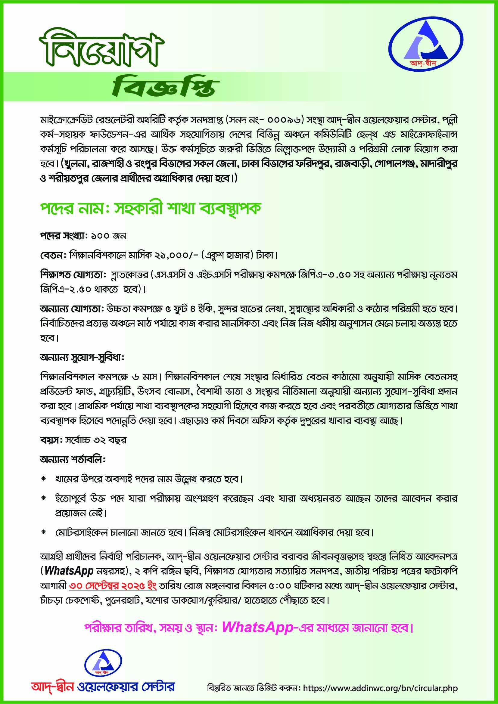 আদ-দ্বীন ওয়েলফেয়ার সেন্টারে বড় নিয়োগ বিজ্ঞপ্তি, পদ ১০০, আবেদন সরাসরি-ডাক-কুরিয়ারযোগে