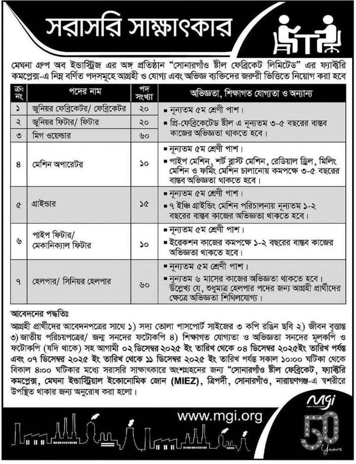 জনবল নিয়োগে বিজ্ঞপ্তি প্রকাশ করেছে দেশের শীর্ষস্থানীয় শিল্পপ্রতিষ্ঠান মেঘনা গ্রুপ অব ইন্ডাস্ট্রিজের অঙ্গপ্রতিষ্ঠান সোনারগাঁও স্টিল ফেব্রিকেট লিমিটেড। প্রতিষ্ঠানটি ফ্যাক্টরি কমপ্লেক্সে ৭টি ভিন্ন পদে ১৯৫ কর্মী নিয়োগে ৩০ নভেম্বর প্রকাশ করেছে এ বিজ্ঞপ্তি। সরাসরি মৌখিক পরীক্ষার মাধ্যমে দেওয়া হবে নিয়োগ। আগ্রহী প্রার্থীরা আগামী ২ থেকে ৪ ডিসেম্বর এবং ৭ থেকে ১১ ডিসেম্বর সকাল ১১টা থেকে বিকেল ৪টার মধ্যে সংশ্লিষ্ট ঠিকানায় সরাসরি উপস্থিত হয়ে মৌখিক পরীক্ষায় অংশগ্রহণ করতে পারবেন।