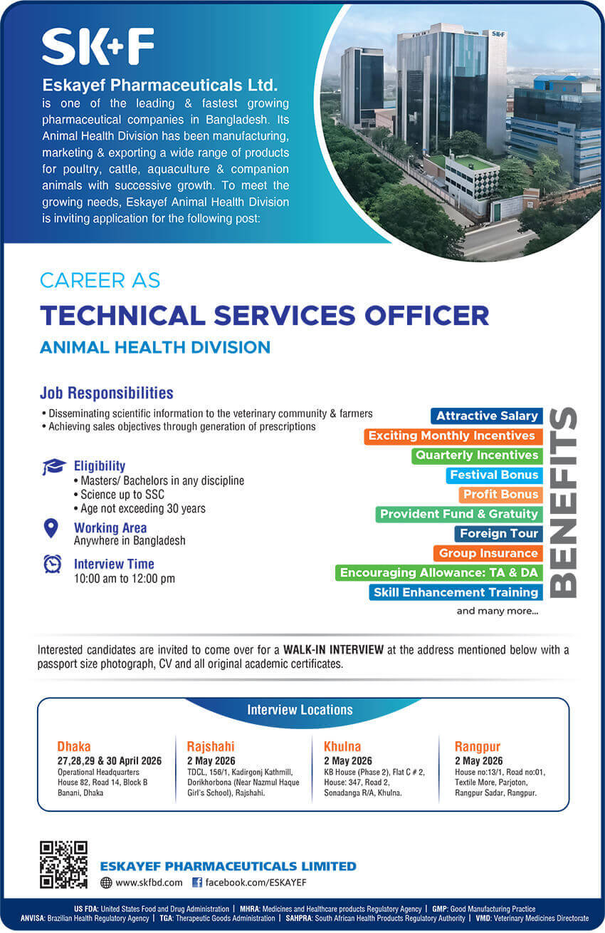 টেকনিক্যাল সার্ভিসেস অফিসার নিয়োগে আবেদন চলছে এসকেএফ ফার্মাসিউটিক্যালস লিমিটেডে © সংগৃহীত