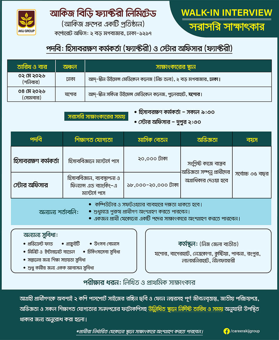 হিসাবরক্ষণ কর্মকর্তা ও স্টোর অফিসার নিয়োগ দেবে আকিজ বিড়ি ফ্যাক্টরি লিমিটেড © সংগৃহীত