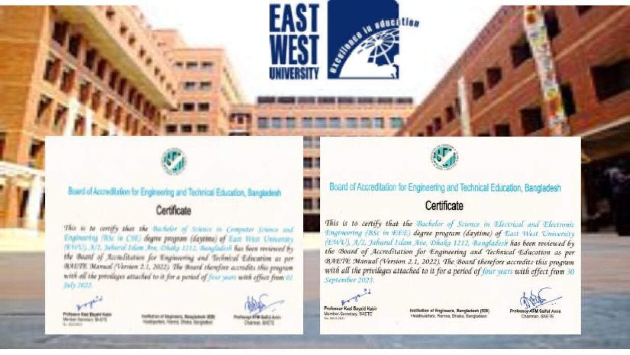 ৪ বছরের জন্য অ্যাক্রেডিটেশন পেয়েছে ইস্ট ওয়েস্ট ইউনিভার্সিটির (ইডব্লিউইউ) কম্পিউটার সায়েন্স অ্যান্ড ইঞ্জিনিয়ারিং (সিএসই) এবং ইলেক্ট্রিক্যাল অ্যান্ড ইলেক্ট্রনিকস ইঞ্জিনিয়ারিং (ইইই) বিভাগ। বোর্ড অফ অ্যাক্রেডিটেশন ফর ইঞ্জিনিয়ারিং এন্ড টেকনিক্যাল এডুকেশন (বিএইটিই) এ স্বীকৃতি প্রদান করেছে।