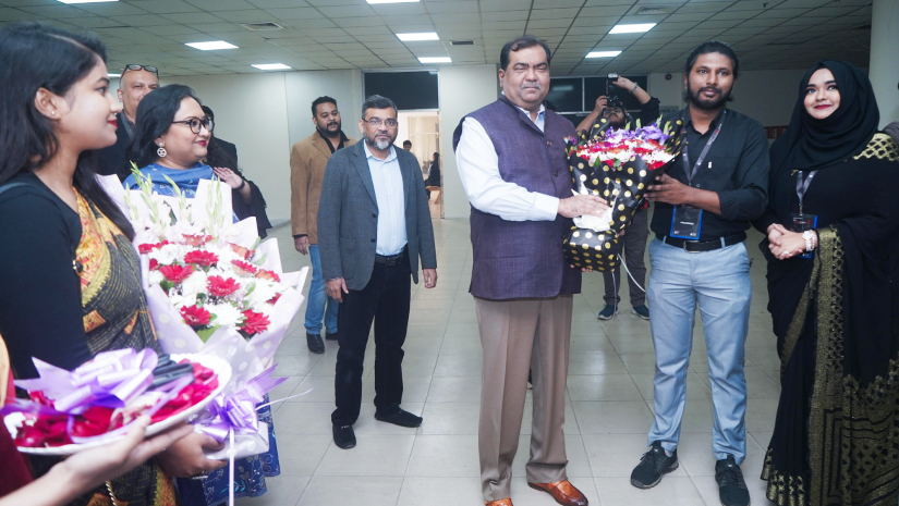 আয়োজনের শুরুতে অতিথিদের ফুল দিয়ে বরণ করেন এআইইউবি ফটোগ্রাফি ক্লাবের প্রেসিডেন্ট। নিজস্ব ছবি।
