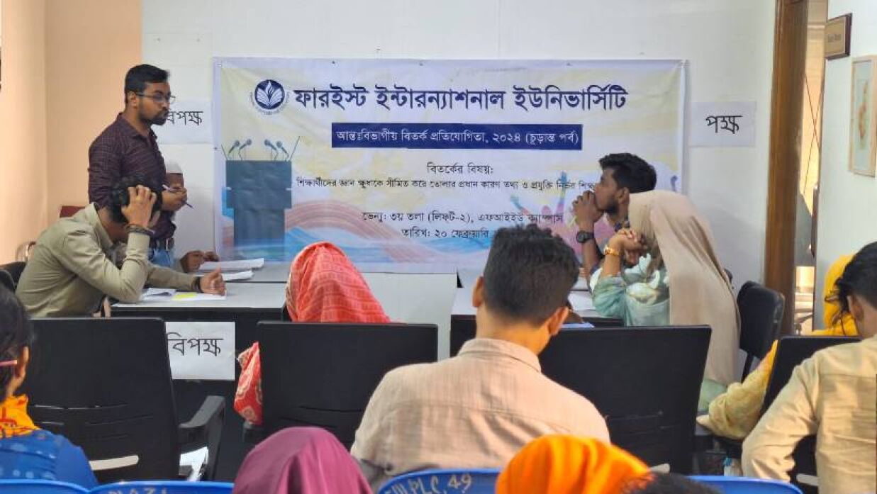 ফারইস্ট ইন্টারন্যাশনাল ইউনিভার্সিটিতে “শিক্ষার্থীদের জ্ঞান ক্ষুধাকে সীমিত করে তোলার প্রধান কারণ তথ্য-প্রযুক্তি নির্ভর শিক্ষা ব্যবস্থা” বিষয়ের উপর বিতর্ক প্রতিযোগিতার চূড়ান্ত পর্ব মঙ্গলবার (২০ ফেব্রুয়ারি) অনুষ্ঠিত হয়। এ প্রতিযোগিতার চূড়ান্ত পর্বে পক্ষ দল “আইন ও বিচার বিভাগ” বিপক্ষ দল কম্পিউটার সায়েন্স অ্যান্ড ইঞ্জিনিয়ারিং বিভাগ (সিএসই) বিভাগকে পরাজিত করে চ্যাম্পিয়ন হওয়ার গৌরব অর্জন করে। এ বিতর্ক প্রতিযোগিতায় ফারইস্ট ইন্টারন্যাশনাল ইউনিভার্সিটির বিভিন্ন বিভাগের মোট ৮ টি দল অংশ নেয়। প্রতিযোগিতায় শ্রেষ্ট বক্তা নির্বাচিত হয় কম্পিউটার সায়েন্স অ্যান্ড ইঞ্জিনিয়ারিং বিভাগ (সিএসই) এর শিক্ষার্থী নওরীন সুলতানা।