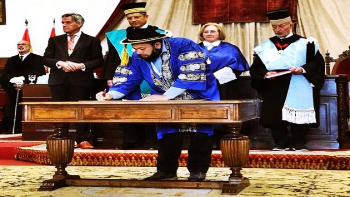স্পেনের রাজা ফিলিপ ষষ্ঠ ও রানী লেটিজিয়ার উপস্থিতিতে ম্যাগনাকার্টা ইউনিভার্সিটামে স্বাক্ষর করছেন মোহাম্মদ ইমরান হোসেন।