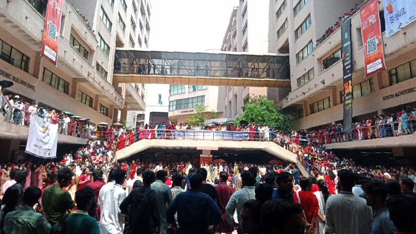 বর্ষবরণের আয়োজনে নর্থ সাউথের ক্যাম্পাসে শিক্ষার্থীদের ঢল। ছবি: টিডিসি ফটো।