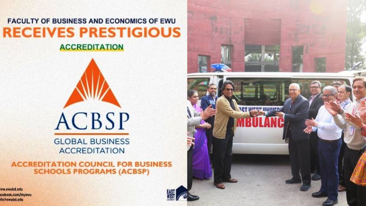ইস্ট ওয়েস্ট ইউনিভার্সিটি’র ব্যবসায় এবং অর্থনীতি অনুষদ কোনও শর্ত ছাড়াই অ্যাক্রেডিটেশন কাউন্সিল ফর বিজনেস স্কুলস প্রোগ্রামস (ACBSP) ‘এসিবিএসপি’ এর দ্বারা আগামী ১০ বছরের জন্য স্বীকৃতি লাভ করেছে। গত অক্টোবর মাসে সংস্থাটির প্রতিনিধিদল ইস্ট ওয়েস্ট বিশ্ববিদ্যালয় পরিদর্শনে করে এবং সম্প্রতি এই স্বীকৃতির ঘোষণা দেয়। এসিবিএসপি, একটি মার্কিন যুক্তরাষ্ট্রের স্বীকৃতি সংস্থা যা কাউন্সিল ফর হায়ার এডুকেশন অ্যাক্রেডিটেশন (CHEA) দ্বারা অনুমোদিত। এই স্বীকৃতির ফলে ব্যবসায় এবং অর্থনীতি অনুষদের শিক্ষক, শিক্ষার্থী এবং তাঁদের অর্জিত ডিগ্রিগুলো আন্তর্জাতিকভাবে অনেক বেশি গ্রহণযোগ্য হয়ে উঠবে। একইসাথে শিক্ষার্থীরা বিশ্বব্যাপী চাকুরির বাজারে নিজেদের আরও যোগ্য হিসেবে উপস্থাপন করতে পারবে।