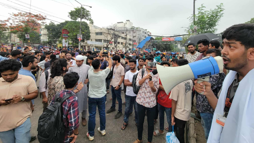 রাজধানীর নতুনবাজার সড়ক অবরোধ করেছেন ইউআইইউ শিক্ষার্থীদের একটি অংশ। (শনিবার সকালে তোলা)
