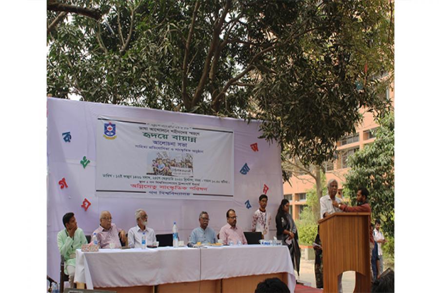 সোমবার বিশ্ববিদ্যালয়ের ট্রান্সপোর্ট ইয়ার্ডে বিশ্ববিদ্যালয়ের অন্যতম সাংস্কৃতিক সংগঠন অগ্নিসেতু সাংস্কৃতিক পরিষদের আয়োজনে ১৯৫২ সালের ভাষা শহীদদের স্মরণে ‘হৃদয়ে বায়ান্ন’ শীর্ষক এক আলোচনা সভায় তিনিএসব কথা বলেন।