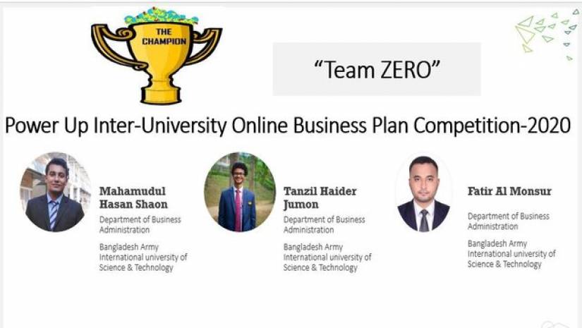 'পাওয়ার আপ আন্তঃবিশ্ববিদ্যালয় অনলাইন ব্যবসায়িক পরিকল্পনা প্রতিযোগিতা'য় বিজয়ী হয়েছে কুমিল্লার বাংলাদেশ আর্মি ইন্টারন্যাশনাল ইউনিভার্সিটি অব সায়েন্স অ্যান্ড টেকনোলজির (বাইউস্ট) শিক্ষর্থীরা।