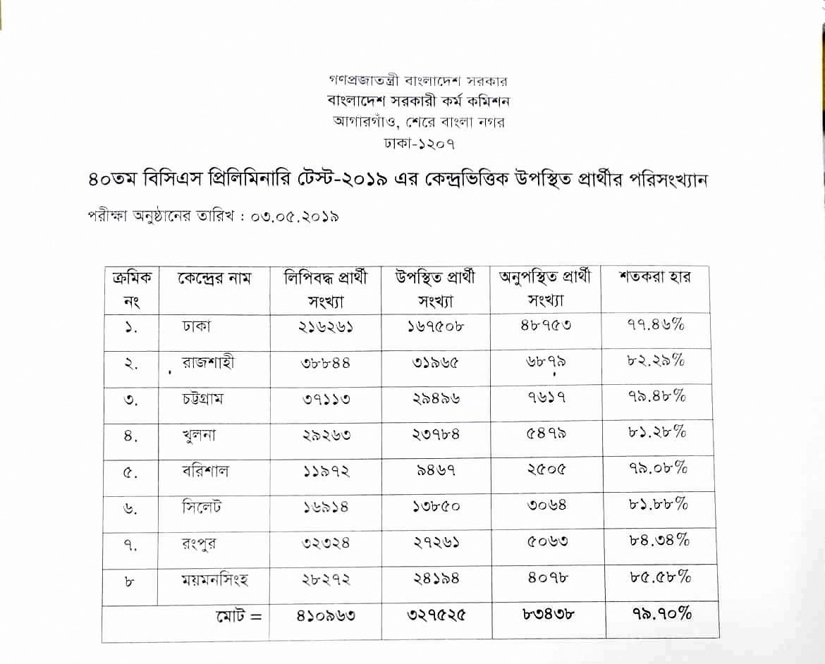 ৪০তম বিসিএস প্রিলিমিনারি পরীক্ষার জন্য ৪ লাখ ১০ হাজার ৯৬৩ জন নিবন্ধন করলেও ৩ লাখ ২৭ হাজার ৫২৫ জন প্রার্থী উপস্থিত ছিলেন। এ পরীক্ষায় অংশ নেয়নি ৮৩ হাজার ৪৩৮ জন প্রার্থী। শতকরা ৭৯ দশমিক ৭০ শতাংশ উপস্থিত ছিলেন। শুক্রবার বিকালে এমনটাই জানিয়েছে সরকারি কর্ম কমিশন।