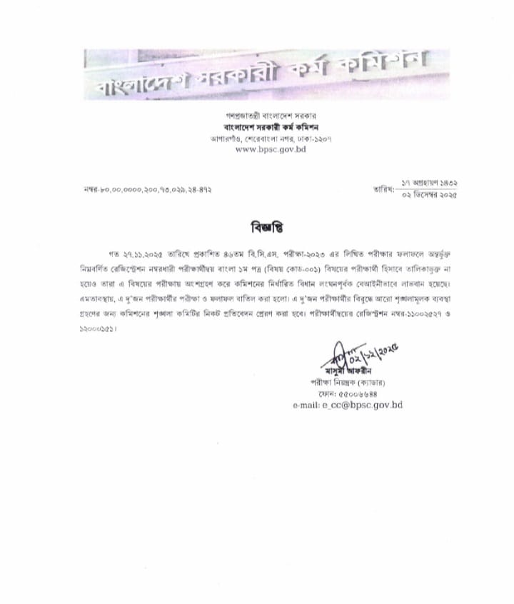 এতে বলা হয়েছে, ৪৬তম বিসিএসের প্রকাশিত ফলে অন্তর্ভুক্ত দুই পরীক্ষার্থী বাংলা প্রথমপত্রের (বিষয় কোড–০০১) পরীক্ষার্থী হিসেবে তালিকাভুক্ত না থাকা সত্ত্বেও পরীক্ষায় অংশ নিয়েছেন। নিয়ম ভঙ্গ করে তারা বেআইনিভাবে পরীক্ষায় সুবিধা নেওয়ায় এটি কমিশনের নির্ধারিত বিধানের স্পষ্ট লঙ্ঘন বলে বিবেচিত হয়েছে। সেজন্য রেজিস্ট্রেশন নম্বর ১১০০২৫২৭ এবং ১২০০০১৫১ এর (দুই পরীক্ষার্থীর) পরীক্ষা ও ফল বাতিল করা হয়েছে। পাশাপাশি তাদের বিরুদ্ধে আরও শৃঙ্খলামূলক ব্যবস্থা নেওয়ার জন্য বিষয়টি কমিশনের শৃঙ্খলা কমিটিতে পাঠানো হবে।