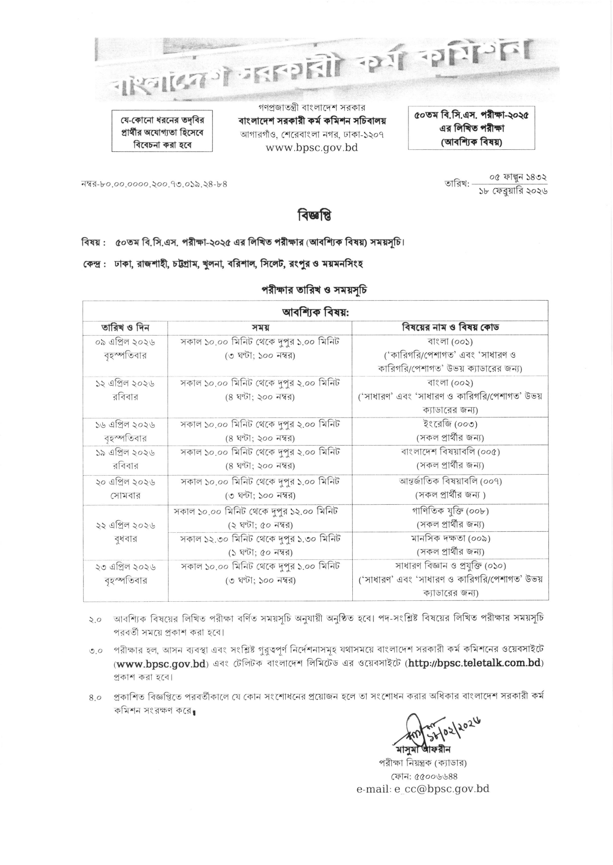 ৫০তম বিসিএসের আবশ্যিক বিষয়ের লিখিত পরীক্ষার সময়সূচি প্রকাশ করেছে বাংলাদেশ সরকারি কর্ম কমিশন (পিএসসি)। সূচি অনুযায়ী, আগামী ৯ এপ্রিল বিভাগীয় শহরগুলোতে এ পরীক্ষা শুরু হবে। লিখিত পরীক্ষা শেষ হবে ২৩ এপ্রিল।