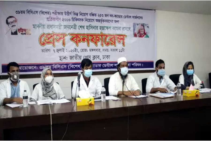 সংবাদ সম্মেলনে বলা হয়, ৩৯তম (বিশেষ) বিসিএস পরীক্ষায় উত্তীর্ণ কিন্তু নিয়োগবঞ্চিত ২৫৩ জন নন-ক্যাডার ডেন্টাল সার্জনকে নিয়োগ প্রক্রিয়াধীন ২ হাজার চিকিৎসকের মধ্যে অন্তর্ভুক্ত করার জন্য প্রধানমন্ত্রী জননেত্রী শেখ হাসিনা এবং স্বাস্থ্যমন্ত্রীর হস্তক্ষেপ কামনা করছি।