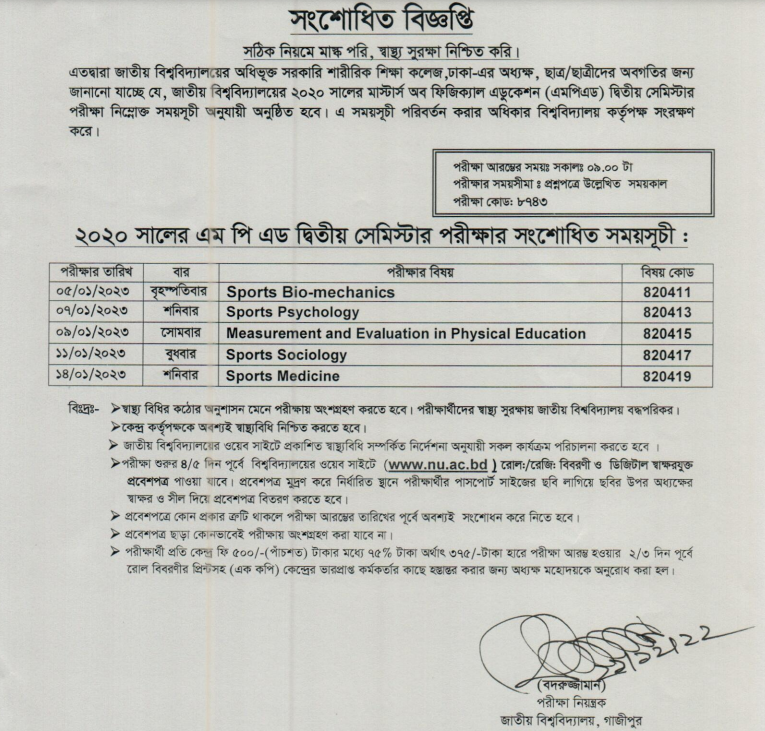 বিজ্ঞপ্তিতে বলা হয়েছে, জাতীয় বিশ্ববিদ্যালয়ের ২০২০ সালের মাস্টার্স অব ফিজিক্যাল এডুকেশন (এমপিএড) দ্বিতীয় সেমিস্টার পরীক্ষা নিম্নোক্ত সময়সূচী অনুযায়ী অনুষ্ঠিত হবে। এ সময়সূচী পরিবর্তন করার অধিকার বিশ্ববিদ্যালয় কর্তৃপক্ষ সংরক্ষণ করে।