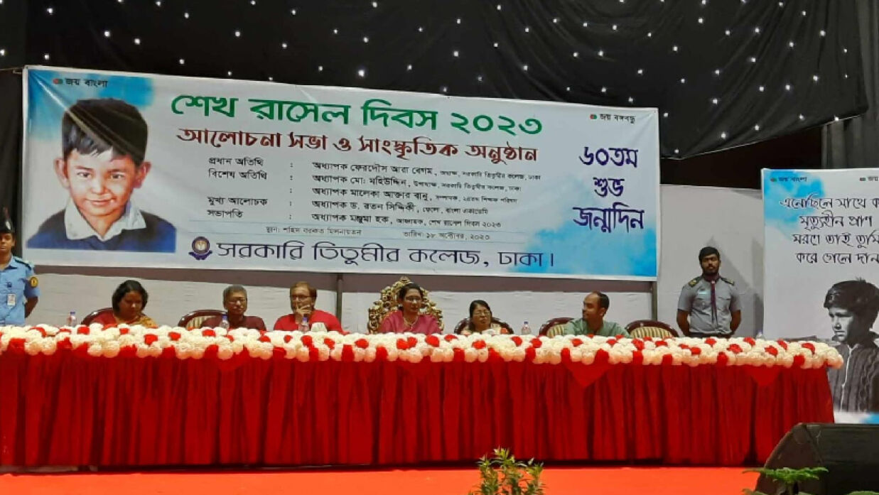রাজধানীর সরকারি তিতুমীর কলেজে শেখ রাসেলের ৬০তম জন্মদিন উপলক্ষে আলোচনা সভা ও সাংস্কৃতিক অনুষ্ঠানের আয়োজন করা হয়েছে। বুধবার (১৮ অক্টোবর) কলেজের শহিদ বরকত মিলনায়তনে এ আলোচনা সভা ও সাংস্কৃতিক অনুষ্ঠান সম্পন্ন হয়।