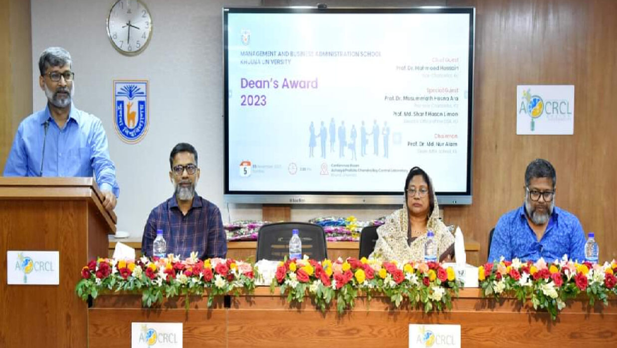 খুলনা বিশ্ববিদ্যালয়ের (খুবি) ব্যবস্থাপনা ও ব্যবসায় প্রশাসন (এমবিএ) স্কুলভুক্ত ২টি ডিসিপ্লিনের মাস্টার্স ও আন্ডারগ্র্যাজুয়েট প্রোগ্রামের ১১ জন মেধাবী শিক্ষার্থীকে ডিনস্ অ্যাওয়ার্ড প্রদান অনুষ্ঠান রবিবার (৫ নভেম্বর) বিকাল ৩টায় আচার্য প্রফুল্ল চন্দ্র রায় কেন্দ্রীয় গবেষণাগারের কনফারেন্স রুমে অনুষ্ঠিত হয়। প্রধান অতিথি হিসেবে অ্যাওয়ার্ডপ্রাপ্ত শিক্ষার্থীদের হাতে ক্রেস্ট ও সম্মাননাপত্র তুলে দেন বিশ্ববিদ্যালয়ের উপাচার্য প্রফেসর ড. মাহমুদ হোসেন।