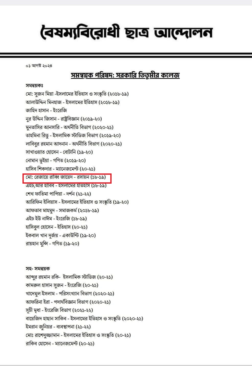 এতে আরও বলা হয়, নিউজটি একটি মিথ্যা অসত্য এ ভিত্তিহীন। আমাকে ২০২১ সালে হাফ ভাড়া আন্দোলনে নেতৃত্ব দেয়ার কারণে লাইভ চলাকালীন তিতুমীর কলেজ ছাত্রলীগ নির্মমভাবে আক্রমণ করে। এমনকি রসায়ন বিভাগ ছাত্রলীগের আরাফাত ও রাব্বি দ্বারা ‘শিবির’ ট্যাগ দিয়ে প্রকাশ্যে মারধর করে। আমার ছাত্রলীগসহ কখনো অন্য কোন রাজনৈতিক সংগঠনের সঙ্গে কোনো রকম সম্পর্ক ছিল না।