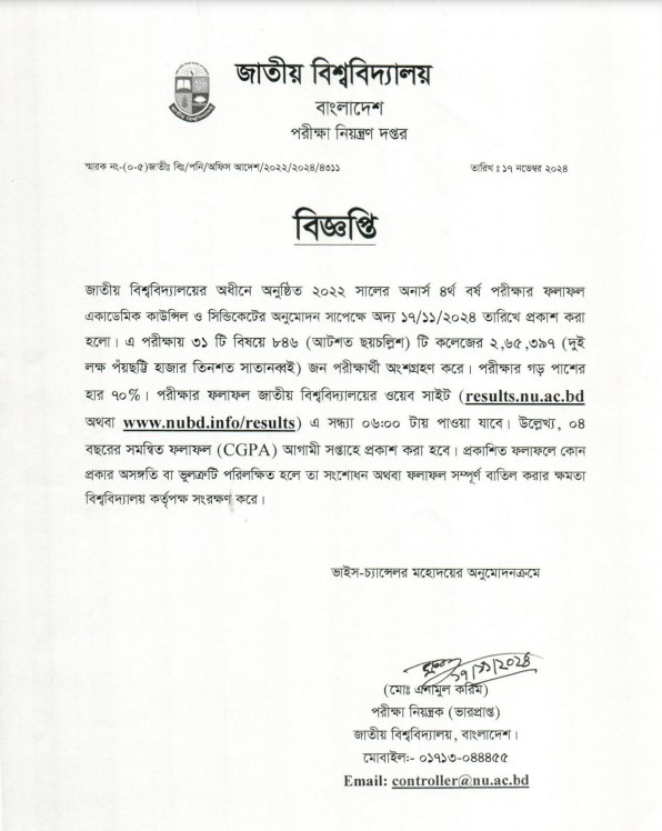 জাতীয় বিশ্ববিদ্যালয়ের অধীনে অনুষ্ঠিত ২০২২ সালের অনার্স ৪র্থ বর্ষ পরীক্ষার ফলাফল প্রকাশ করা হয়েছে। এ বছর গড় পাশের হার ৭০%। রবিবার(১৭ নভেম্বর) রাত ৬টা থেকে এই পরীক্ষার ফলাফল বিশ্ববিদ্যালয়ের ওয়েবসাইটে (www.nubd.info/results অথবা results.nu.ac.bd) পাওয়া যাবে।