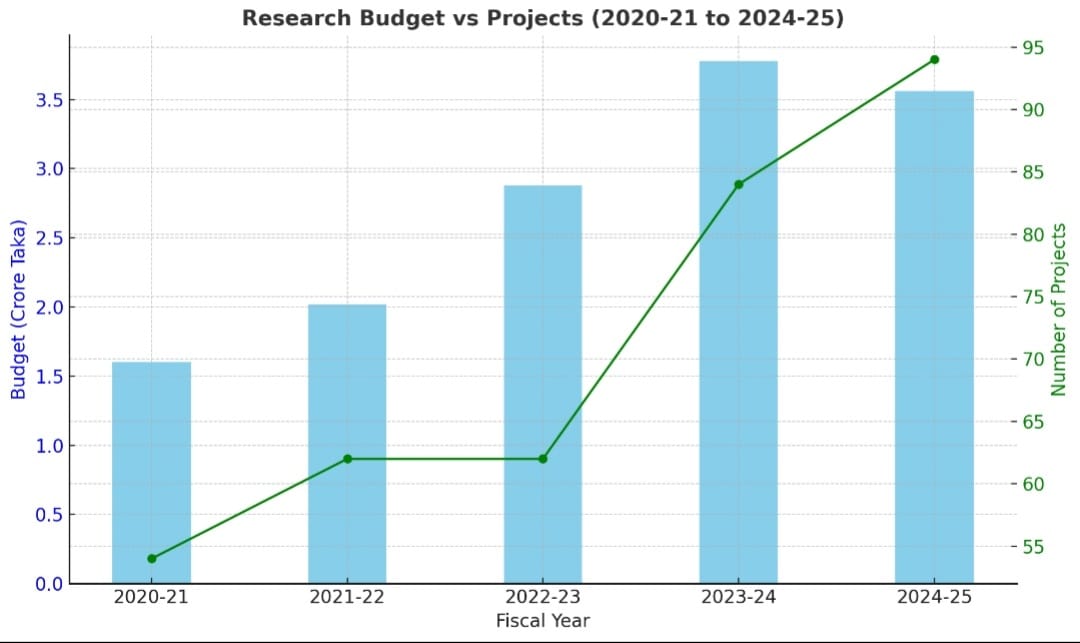 উল্লেখ্য ২০২৩-২৪ অর্থ বছরে প্রকৃত গবেষণা বরাদ্দ ছিল ৩ কোটি ৭৮ লক্ষ টাকা, প্রকল্প ছিল ৮৪টি। অর্থাৎ গত বছরের তুলনায় ২২ লক্ষ ৭৮ হাজার টাকা বাজেট কমলেও গবেষণা প্রকল্প বেড়েছে ১০ টি। ২০২২-২৩ অর্থ বছরে প্রকৃত গবেষণা বরাদ্দ ছিল ২ কোটি ৮৮ লাখ টাকা, প্রকল্প ছিল ৬২টি। ২০২১-২২ অর্থ বছরে প্রকৃত গবেষণা বরাদ্দ ছিল ২ কোটি ১ লক্ষ ৯০ হাজার টাকা, প্রকল্প ছিল ৬২ টি। আর ২০২০-২১ সালে প্রকৃত বরাদ্দ ছিল মাত্র ১ কোটি ৬০ লাখ টাকা, প্রকল্প সংখ্যা ৫৪। হিসাব বলছে, গত পাঁচ বছরে গবেষণার বরাদ্দ বেড়েছে আড়াই গুণ, কিন্তু প্রকল্পের সংখ্যাও বেড়েছে প্রায় দ্বিগুণ।