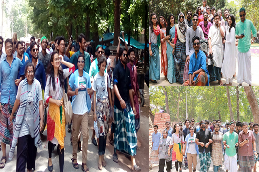 আজ সোমবার দুপুরে বিশ্ববিদ্যালয় টুকিটাকি চত্বর থেকে লুঙ্গি পরে শিক্ষার্থীরা এমন একটি মিছিল বের করেন। মিছিলটি ক্যাম্পাসের গুরুত্বপূর্ণ সড়ক প্রদক্ষিণ শেষে গন্তব্য করে পশ্চিম পাড়াকে। এসময় শিক্ষার্থীরা ‘গরমের সঙ্গী, আমাদের লুঙ্গি’ ইত্যাদি শ্লোগান দিতে থাকেন। ছাত্রীদের অনেকেই লুঙ্গি না পেয়ে ওড়নাকে লুঙ্গির মতো করে পরেও শামিল হন তাদের সাথে।