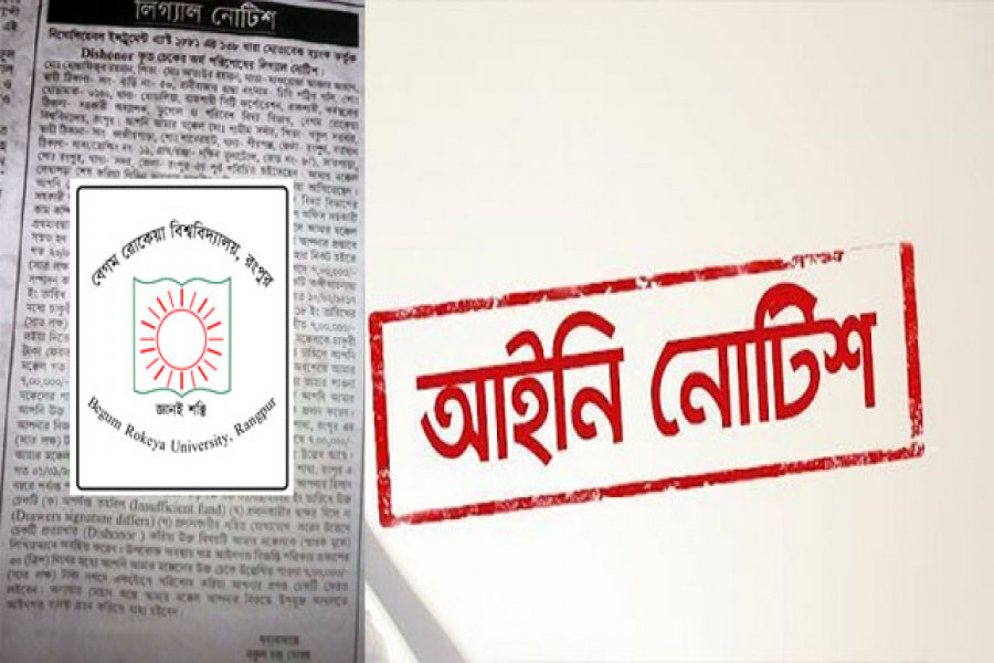 চাকরি দেওয়ার নামে ৭ লাখ টাকা নিয়ে আত্মসাতের অভিযোগ তুলে বেগম রোকেয়া বিশ্ববিদ্যালয়ের (বেরোবি) ভূগোল ও পরিবেশ বিদ্যা বিভাগের সহকারী অধ্যাপক মোস্তাফিজুর রহমানের নামে লিগ্যাল নোটিশ পাঠিয়েছেন বকুল চন্দ্র মোহন্ত নামে এক ব্যক্তি। চাকরি দেওয়ার নামে গৃহীত টাকার চেকের অর্থ পরিশোধ করতে এই নোটিশ পাঠান তিনি।