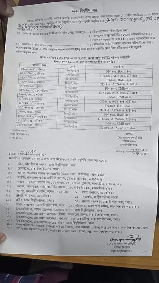 ঢাকা বিশ্ববিদ্যালয় (ঢাবি) উপাদানকল্প ৪টি গার্হস্থ্য অর্থনীতি কলেজ শিক্ষার্থীদের ২০১৯ সালের চতুর্থ বর্ষের অনার্স পরীক্ষার সময়সূচি প্রকাশ করা হয়েছে। করোনা পরিস্থিতিতে সামাজিক দূরত্ব বজায় রেখে ও স্বাস্থ্যবিধি মেনে আগামী ৩ জুলাই থেকে এ পরীক্ষা শুরু হবে।