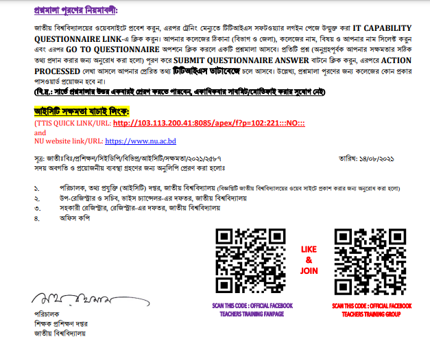 বিজ্ঞপ্তিতে বলা হয়েছে, রাষ্ট্রবিজ্ঞান, ইসলামের ইতিহাস ও সংস্কৃতি, অর্থনীতি ও পদার্থ বিজ্ঞান বিষয়ের আগামী সেপ্টেম্বরের শেষ সপ্তাহে শুরু হবে। অনলােইনে অনুষ্ঠিতব্য এই প্রশিক্ষণ কার্যকর ও সফলভাবে করার জন্য প্রশিক্ষণার্থীদের সক্ষমতা যাচাই করা হবে। এজন্য একটি প্রশ্নমালা তৈরি করা হয়েছে। প্রশিক্ষণ গ্রহণে ইচ্ছুক শিক্ষকদের প্রশ্নমালা পূরণ করে পাঠাতে বলা হয়েছে।