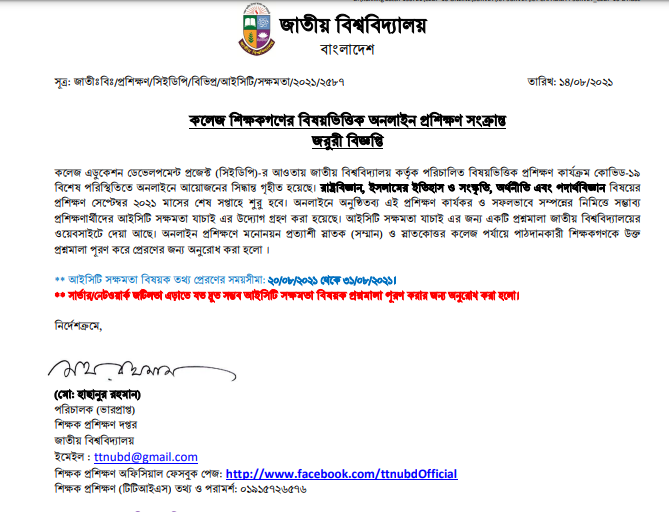 শনিবার (১৪ আগস্ট) জাতীয় বিশ্ববিদ্যালয়ের শিক্ষক প্রশিক্ষণ দপ্তরের ভারপ্রাপ্ত পরিচালক হাছানুর রহমান স্বাক্ষরিত এক বিজ্ঞপ্তিতে এ তথ্য জানানো হয়েছে।