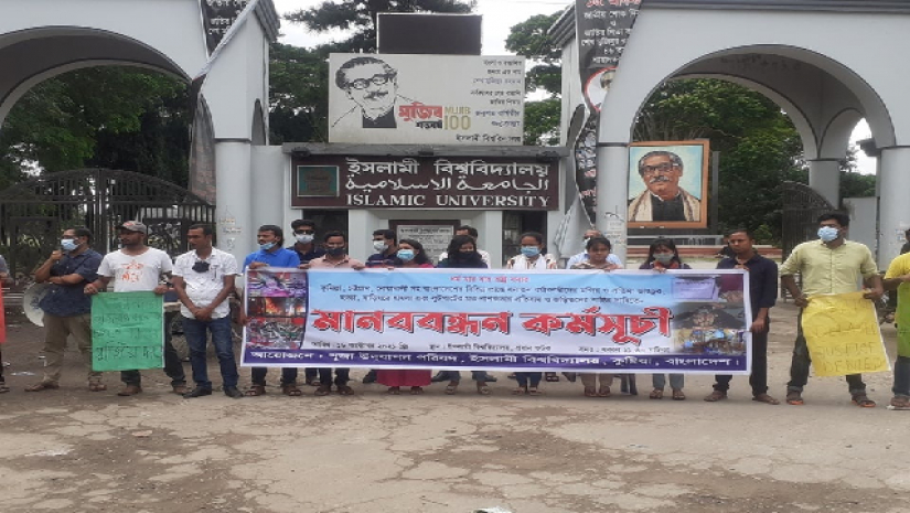 এসময় প্রায় অর্ধশতাধিক শিক্ষার্থী ‘পূজা মন্ডপে ভাঙচুর কেন, বিচার চাই’, ‘সংখ্যালঘুর রক্ত, কবে হবে বন্ধ?’, ’সাম্প্রদায়িক নিপীড়ন আর নয়, আর নয়,’ প্রভৃতি ফেস্টুন হাতে মানববন্ধনে অংশ নেন।