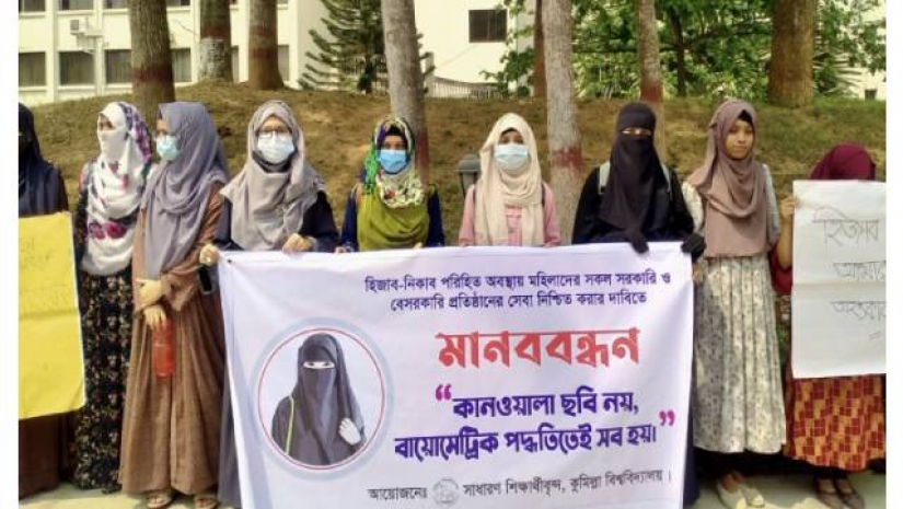 মানববন্ধনে শিক্ষার্থীরা বলেন, বিশ্ববিদ্যালয়ের ভর্তি পরীক্ষা থেকে শুরু করে সব ক্ষেত্রে নারীদের হিজাব খুলে কান বের করে ছবি দিতে হয়। এই নিয়ম বাতিল করে হিজাব-নিকাব মেনে চলা মেয়েদের জন্য বায়োমেট্রিক পদ্ধতি ব্যবহার করার দাবি জানায়।