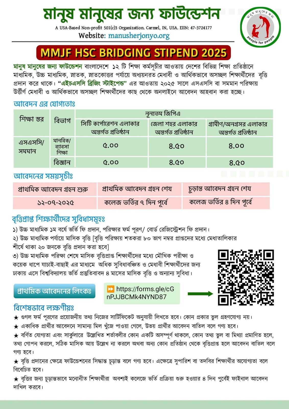 ২০২৫ সালে এসএসসি বা সমমানের পরীক্ষায় উত্তীর্ণদের শিক্ষাবৃত্তি দেবে যুক্তরাষ্ট্রভিত্তিক অলাভজনক দাতব্য সংগঠন মানুষ মানুষের জন্য ফাউন্ডেশন। প্রতিষ্ঠানটি উচ্চ মাধ্যমিকে ভর্তিতে সহায়তা ও মাসিক বৃত্তি প্রদানের লক্ষ্যে মেধাবী ও আর্থিকভাবে অস্বচ্ছল প্রার্থীদের নিকট আবেদনপত্র আহ্বান করেছে। আবেদন করতে হবে অনলাইনে। আবেদন শুরু হয়েছে ১২ জুলাই থেকে—আবেদন করা যাবে কলেজে ভর্তির ৭ দিন পূর্ব পর্যন্ত। আগ্রহী প্রার্থীরা নির্ধারিত সময়ের মধ্যে আবেদন করতে পারবেন।