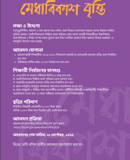 ২০২৫ সালের এসএসসি পাস করা শিক্ষার্থীদের মেধাবিকাশ বৃত্তি দেবে ব্র্যাক। এ লক্ষ্যে বিজ্ঞপ্তি প্রকাশ করেছে সংস্থাটি। অর্থনৈতিকভাবে পিছিয়ে থাকা মেধাবী শিক্ষার্থীরা পারবেন এ বৃত্তিতে আবেদন করতে। প্রার্থীরা ২০২৫–২৬ শিক্ষাবর্ষে কলেজে একাদশ শ্রেণিতে ভর্তির জন্য নির্বাচিত হলেই আবেদনের সুযোগ পাবেন। আগ্রহী প্রার্থীদের আগামী আগামী ২২ সেপ্টেম্বর ২০২৫ তারিখের মধ্যে অনলাইনে আবেদন করতে হবে।