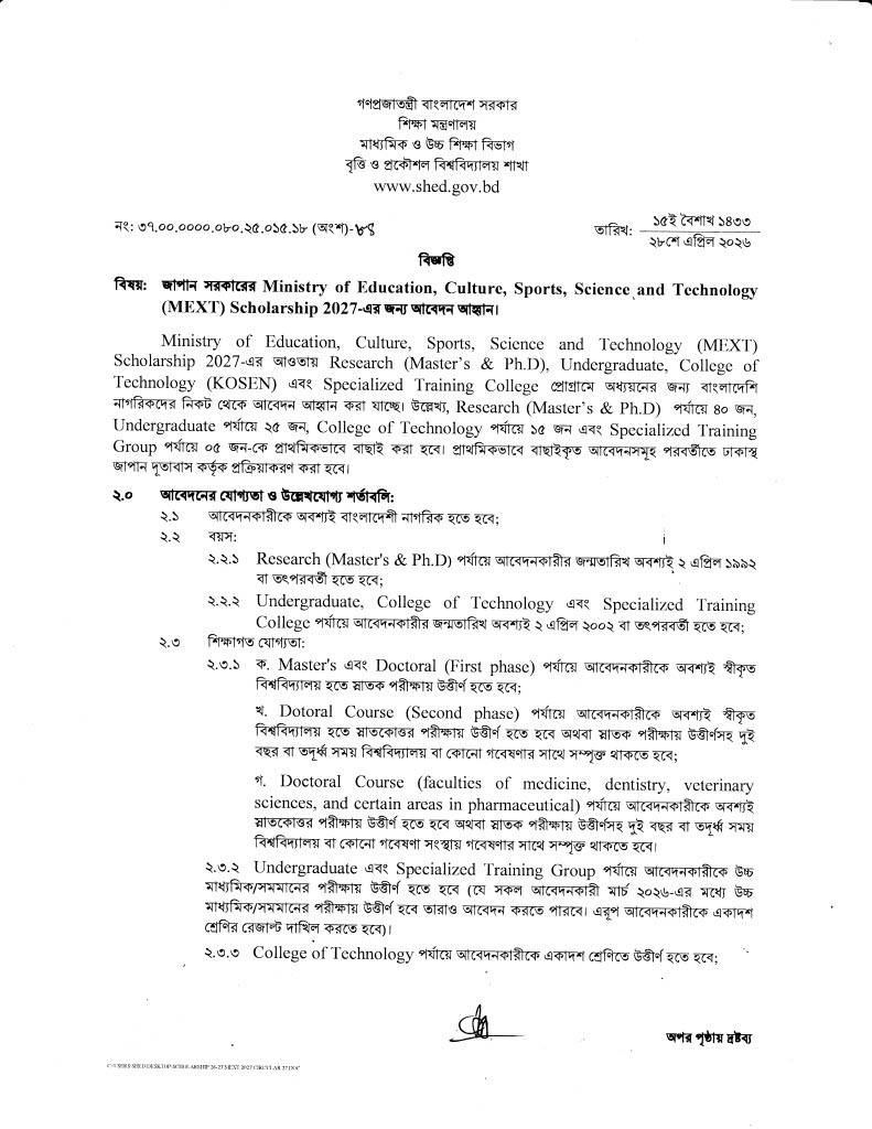 জাপান সরকার আন্তর্জাতিক শিক্ষার্থীদের স্নাতক-স্নাতকোত্তর-পিএইচডি এবং স্পেশালাইজড ট্রেনিং প্রোগ্রামে স্কলারশিপ দেবে। মেক্সট বৃত্তির আওতায় জাপান সরকার এ স্কলারশিপ দিয়ে থাকে। এ লক্ষ্যে আবেদনপত্র আহ্বান করা হয়েছে। এই স্কলারশিপের আওতায় জাপানের স্বীকৃত বিশ্ববিদ্যালয় ও প্রতিষ্ঠানে রিসার্চ (মাস্টার্স ও পিএইচডি), স্নাতক, কলেজ অব টেকনোলজি (কোসেন) এবং স্পেশালাইজড ট্রেনিং কলেজ প্রোগ্রামে অধ্যয়নের সুযোগ রয়েছে। এই বৃত্তি মেধাবী শিক্ষার্থীদের জাপানে পূর্ণ অর্থায়নে উচ্চশিক্ষা ও উন্নত গবেষণার সুযোগ প্রদান করে।