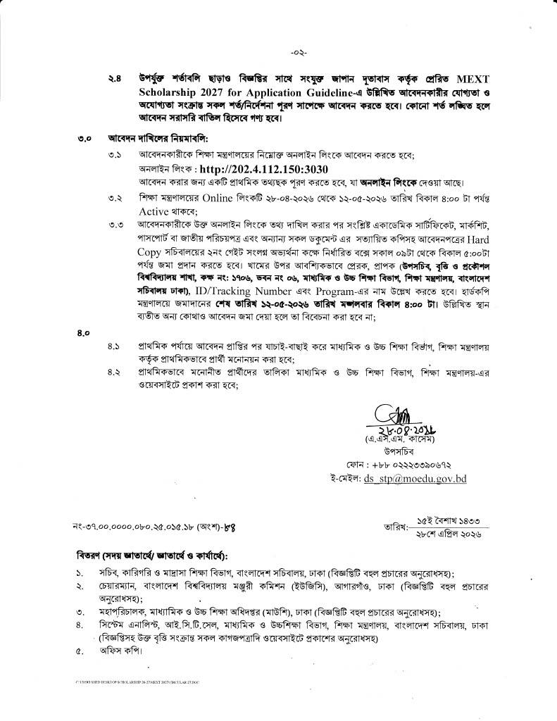 আগ্রহী প্রার্থীদের শিক্ষা মন্ত্রণালয়ের নির্ধারিত অনলাইন পোর্টালের মাধ্যমে আবেদন করতে হবে এবং জাপান দূতাবাসের নির্দেশিকা অনুসরণ করতে হবে।