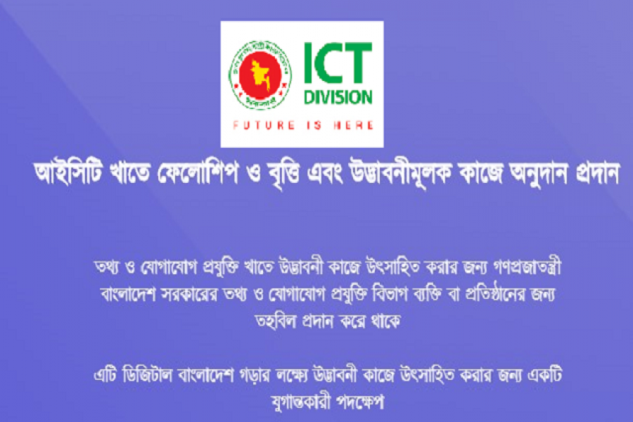 সরকারের তথ্য ও যোগাযোগ প্রযুক্তি বিভাগ আইসিটি খাতে গবেষণার জন্য ‘হাই-প্রোফাইল আইসিটি স্কলার ফেলোশিপ’ প্রদানের জন্য অনলাইনে আবেদনপত্র আহবান করেছে। ২০১৯-২০ অর্থবছরের এ আবেদন নেয়া হচ্ছে।