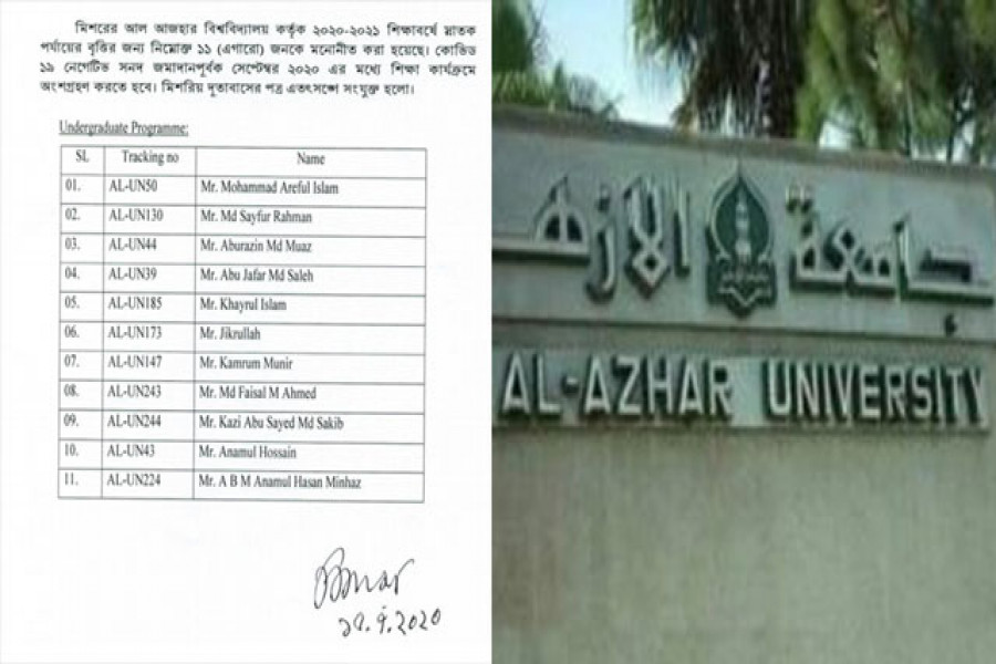 মিশর সরকার কর্তৃক প্রদত্ত শিক্ষাবৃত্তির আওতায় আল আজহার বিশ্ববিদ্যালয়ে ২০২০-২০২১ শিক্ষাবর্ষে স্নাতক পর্যায়ের বৃত্তির জন্য ১১ বাংলাদেশি শিক্ষার্থীতে মনোনীত করা হয়েছে। কোভিড-১৯ নেগেটিভ সনদ জমাদানপূর্বক আগামী সেপ্টেম্বরের মধ্যে তাদেরকে শিক্ষা কার্যক্রমে অংশগ্রহণ করতে হবে বলে মিশরীয় দূতাবাসে জানিয়েছে। আজ বুধবার এক বিজ্ঞপ্তিতে এ তথ্য জানায় শিক্ষা মন্ত্রণালয়।