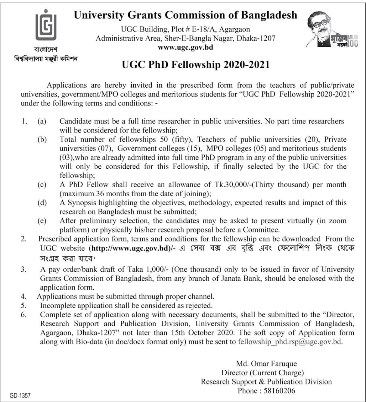 বিশ্ববিদ্যালয় মঞ্জুরি কমিশন (ইউজিসি) পিএইচডি ফেলোশিপ প্রোগ্রাম- ২০২০-২১ এর আবেদন প্রক্রিয়া শুরু হয়েছে। দেশের সরকারি-বেসরকারি বিশ্ববিদ্যালয়ের শিক্ষক এবং সরকারি ও এমপিওভুক্ত কলেজ শিক্ষকরা পিএইচডি প্রোগ্রামে ফেলোশিপের জন্য আবেদন করতে পারবেন।