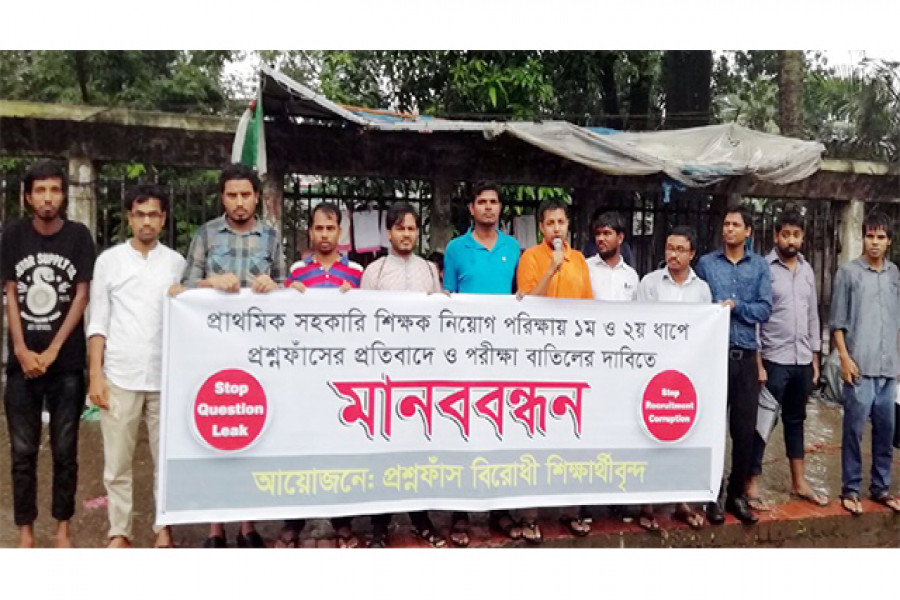 প্রাথমিক সহকারী শিক্ষক নিয়োগ পরীক্ষার বাতিলের দাবিতে মানববন্ধন করেছে শিক্ষার্থীরা। প্রাথমিকে প্রথম ও দ্বিতীয় ধাপে প্রশ্নফাঁসের অভিযোগ তুলে পুনরায় পরীক্ষা নেয়ার দাবি জানিয়েছেন তারা। শুক্রবার (১২ জুলাই) দুপুরে রাজধানীর জাতীয় প্রেস ক্লাবের সামনে মানববন্ধন করেন প্রশ্নফাঁসবিরোধী শিক্ষার্থীরা। মানববন্ধনে সাধারণ ছাত্র অধিকার সংরক্ষণ পরিষদের নেতাকর্মীরাও অংশগ্রহণ করে।