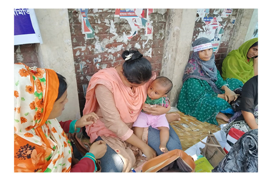 জাতীয় প্রেস ক্লাবের সামনের ফুটপাতে অপলক দৃষ্টিতে তাকিয়ে মায়ের কোলে বসে আছে ছোট্ট দুটি শিশু। আট মাস বয়সের সবচেয়ে ছোট শিশুটি কিছুক্ষণ পরপর বমি আর আর কান্না করছে। আরেকজনের বয়স তিন বছর। গত কয়েকদিনের প্রচণ্ড গরমে তাদের অবস্থা নাজেহাল। শিশু দুইটি এও জানেনা তারা কেন এখানে অবস্থান করছে। নিষ্পাপ মুখ দুটি যে কারও হৃদয় গলিয়ে দেবে।
