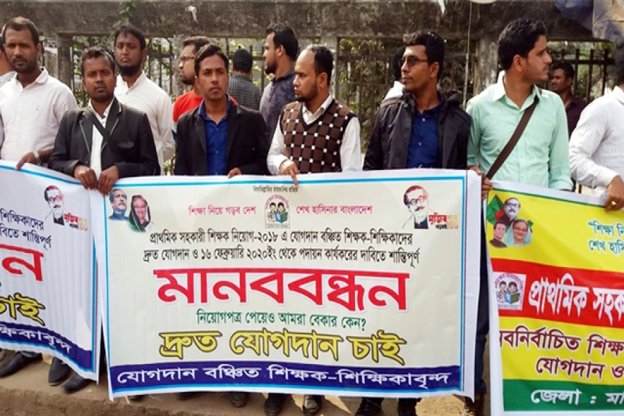 সরকারি প্রাথমিক বিদ্যালয়ের সহকারী শিক্ষক নিয়োগ পরীক্ষায় চূড়ান্ত পাস করেও যোগদান বঞ্চিত হওয়ায় আন্দোলনে নেমেছেন ৪০ জেলার নিয়োগ প্রত্যাশীরা। দ্রুত যোগদান ও পদায়নসহ তিন দফা দাবিতে রবিবার জাতীয় প্রেসক্লাবের সামনে মানববন্ধন ও বিক্ষোভ পালন করছেন তারা।
