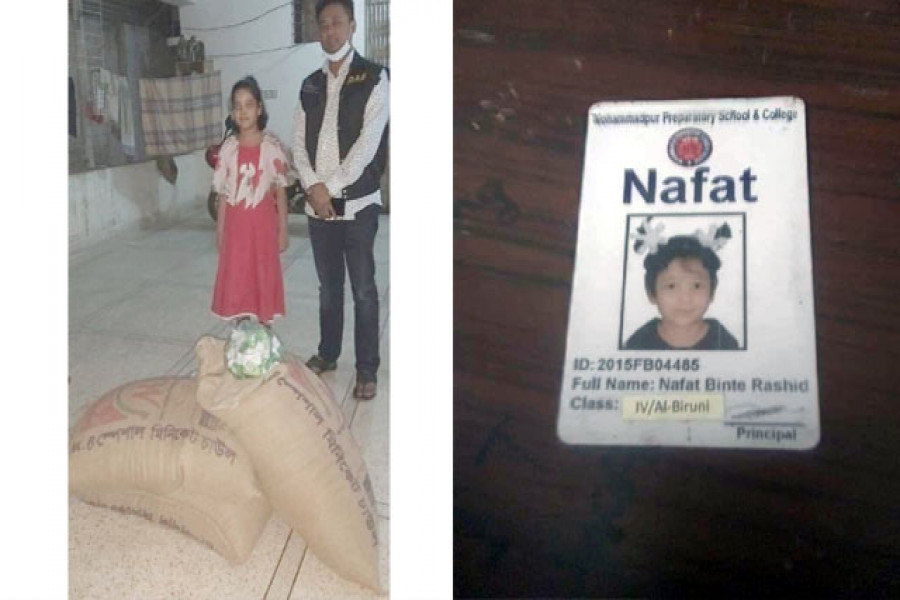 নেফাত বিনতে রশীদ। রাজধানর মোহাম্মদপুর প্রিপারেটরি স্কুল অ্যান্ড কলেজের চতুর্থ শ্রেণির ছাত্রী। দেশে করোনা প্রাদুর্ভাবে খেটে খাওয়া মানুষ ‘অভুক্ত’। টেলিভিশনে এমন খবর দেখে পাশে দাঁড়িয়েছে এই স্কুলছাত্রী। মাটির ব্যাংকে নিজের জমানো টাকা দিয়ে কেনে চাল, ডাল ও সাবান। পরে ফোনে ডেকে আনে র‌্যাবের এক কর্মকর্তাকে তুলে দেয় দুঃস্থদের মাঝে এসব খাবারসামগ্রী। এসব খাবারের মধ্যে রয়েছে- ৫০ কেজির তিন বস্তা চাল, এক বস্তা ডাল এবং ৫৩টি সাবান।