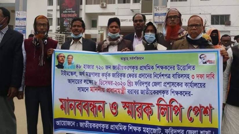 তিন দফা দাবিতে সারাদেশে মানববন্ধন পালন করেছেন জাতীয়করণ হওয়া প্রাথমিক বিদ্যালয়ের শিক্ষকরা। একই দাবিতে আজ মঙ্গলবার (৮ ডিসেম্বর) দেশের সব জেলা প্রশাসকের মাধ্যমে প্রধানমন্ত্রীকে স্মারকলিপি দেয়া হয়েছে। জাতীয়করণ হওয়া শিক্ষকদের জাতীয় মহাজোটের পক্ষ থেকে গণমাধ্যমে পাঠানো এক বিজ্ঞপ্তিতে বিষয়টি জানানো হয়েছে।