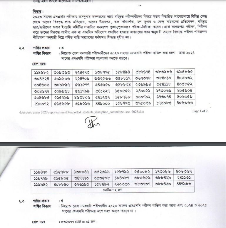 সভার কার্যবিবরণীর তথ্য অনুযায়ী, ‘ক’ শ্রেণিভুক্ত অপরাধ করায় ৭২ শিক্ষার্থীর ফল বাতিল করা হয়েছে। আর ‘গ’ শ্রেণিভুক্ত দোষী সাব্যস্ত হওয়া এক শিক্ষার্থীর পরীক্ষা দুই বছরের জন্য বাতিল করা হয়েছে।