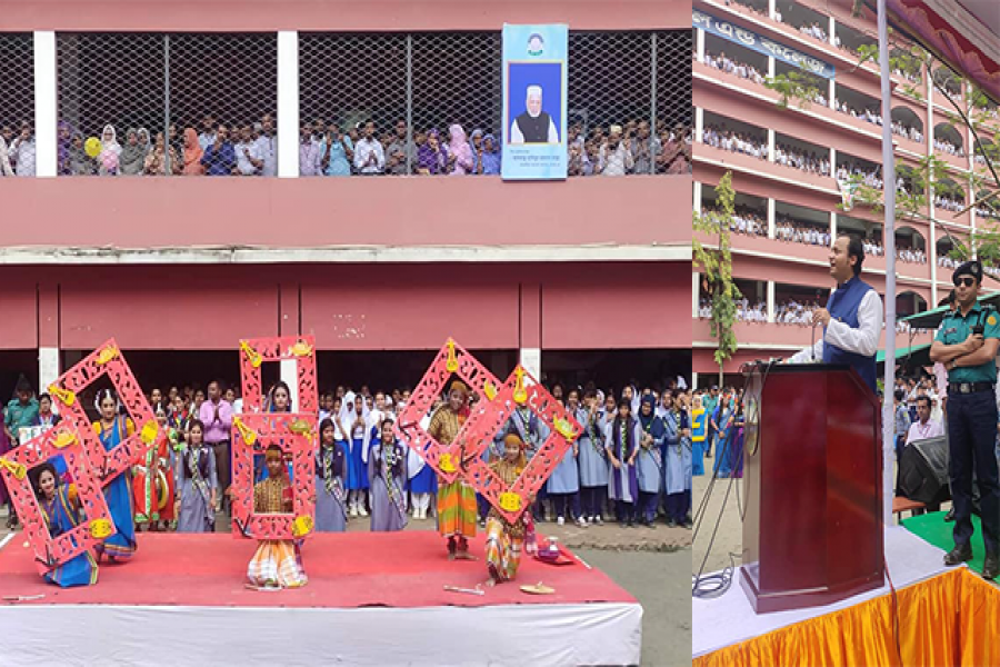 দর্শনার্থী, অতিথিরা স্কুল ভবনের বারন্দায়। মাঠের মাঝে স্থাপিত মঞ্চে বক্তব্য দিচ্ছেন প্রধান অতিথি। অন্যান্য পারফরমাররাও মঞ্চে পারফরম করছেন, শিক্ষার্থীরা দেখছেন ভবনের বারান্দা থেকেই।