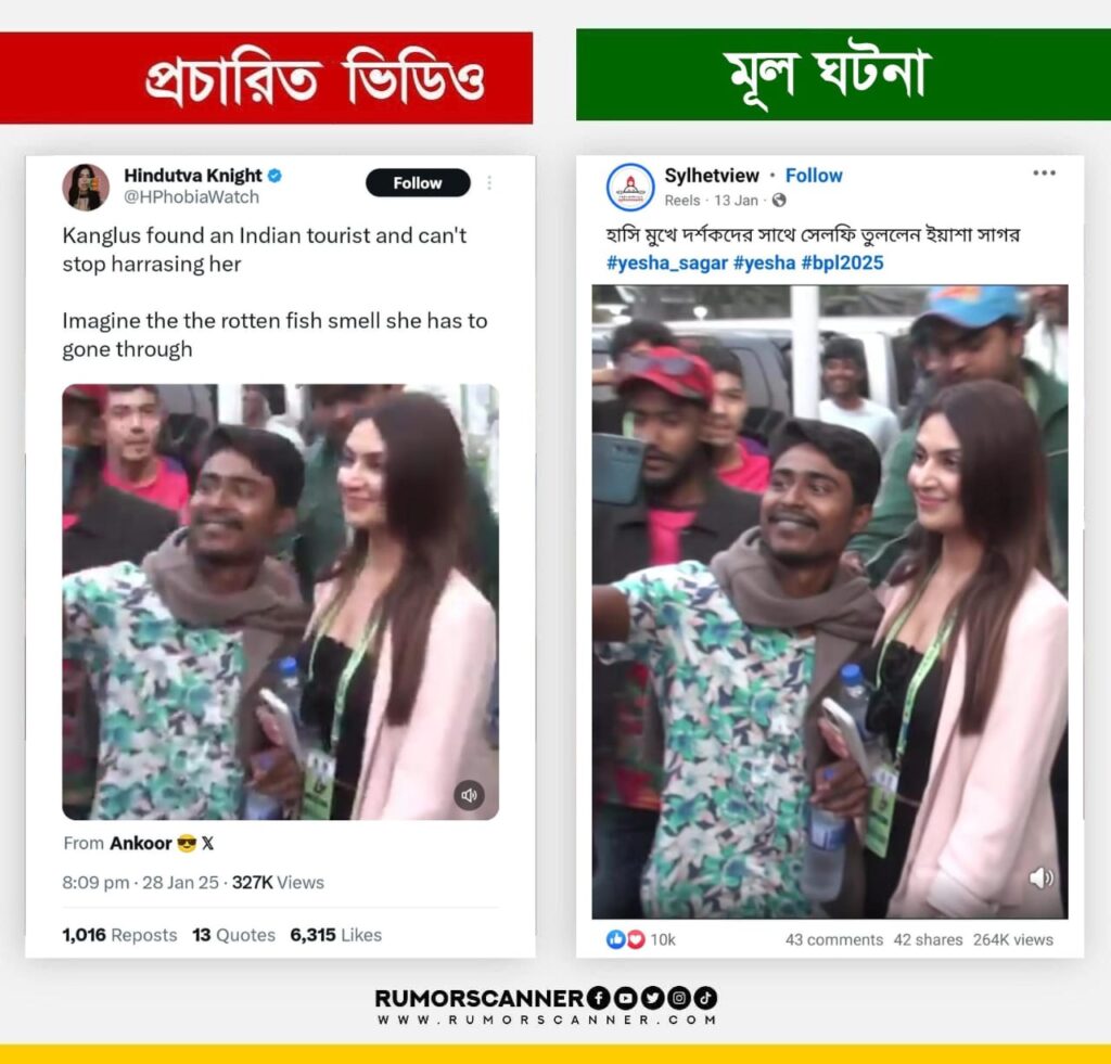 সুতরাং বিপিএল হোস্ট (উপস্থাপক) ইয়াশা সাগরের সঙ্গে একজন ভক্তের ছবি তোলার সময় ধারণকৃত দৃশ্যকে বাংলাদেশে বেড়াতে আসা ভারতীয় পর্যটককে হয়রানির দৃশ্য দাবিতে প্রচার করা হয়েছে, যা মিথ্যা।