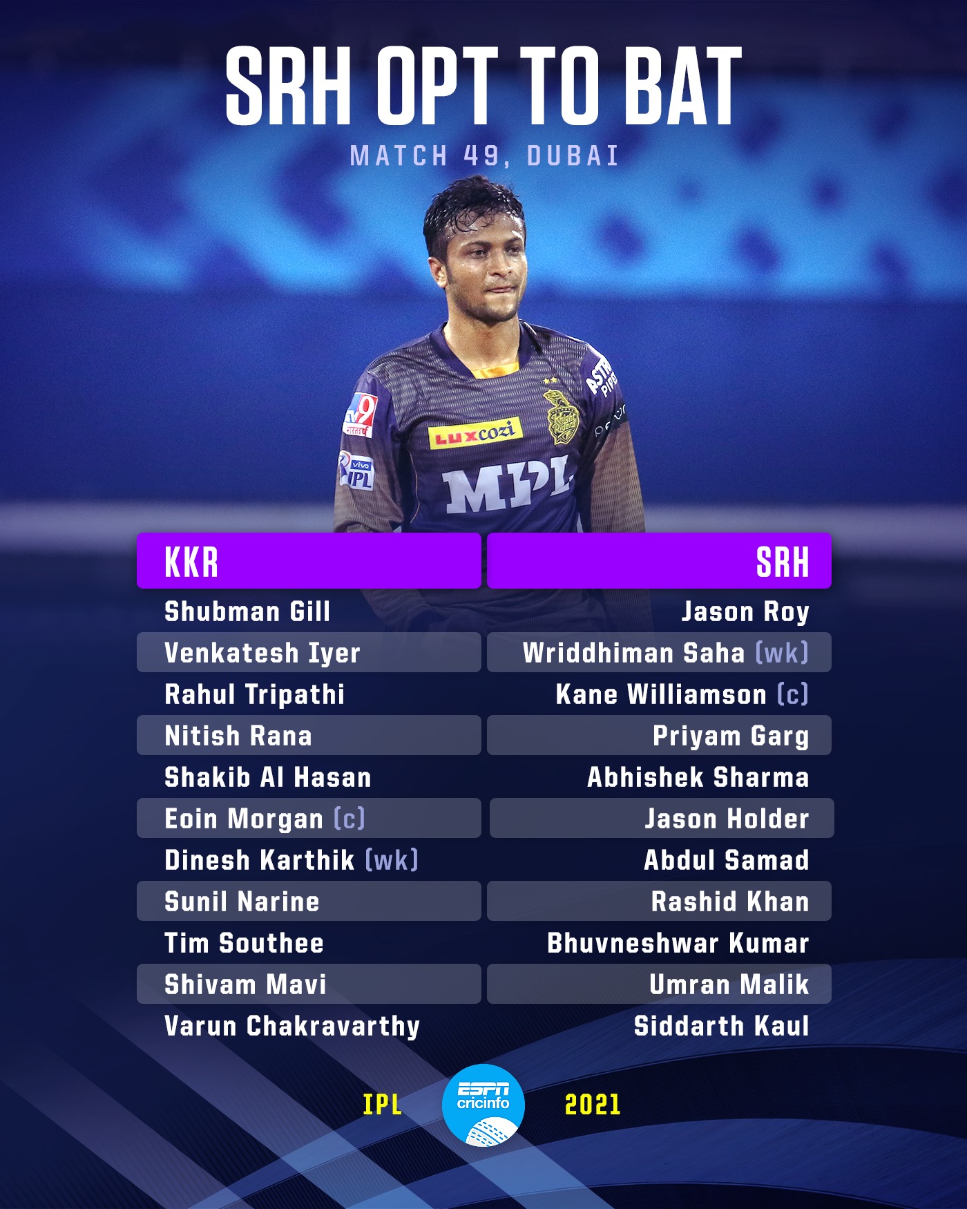 ম্যাচে দুই দলেই এসেছে একটি করে পরিবর্তন। কলকাতা একাদশে টিম সেইফার্টের জায়গায় নেয়া হয়েছে সাকিবকে। অন্যদিকে সন্দ্বীপ শর্মার জায়গায় উমরান মালিককে নিয়েছে হায়দরাবাদ।